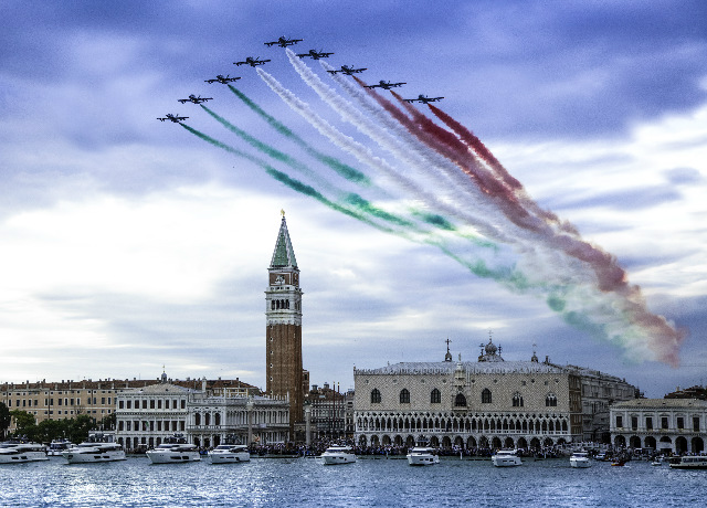 Dalle finestre del Palazzo Ducale gli ospiti hanno assistito alla parata della flotta Ferretti Yachts. All’imbrunire occhi puntati all’insù per le evoluzioni della Pattuglia Acrobatica Nazionale, Frecce Tricolori, nel giorno dell’anniversario della “Battaglia del Solstizio”, con la quale esattamente 100 anni fa, nel giugno 1918, l’Esercito Italiano resistette eroicamente all’ultima offensiva Austro-Ungarica e durante la quale perse la vita il maggiore Francesco Baracca, Asso degli Assi dell’Aviazione Italiana.