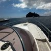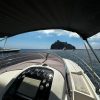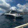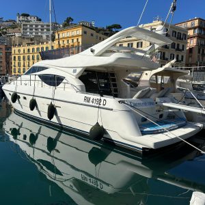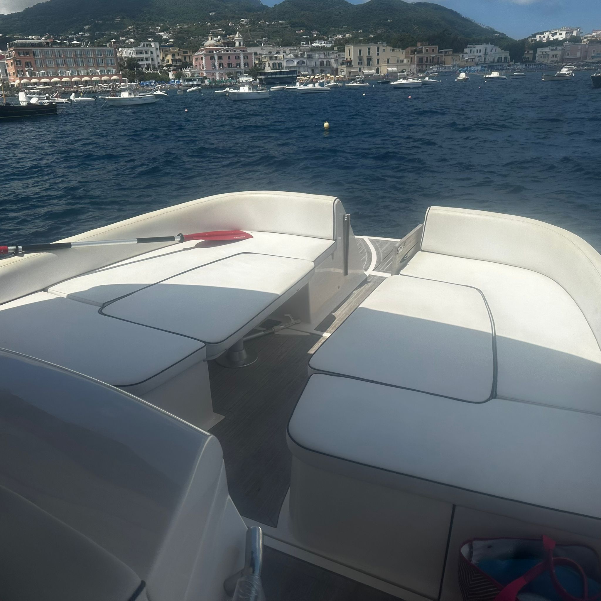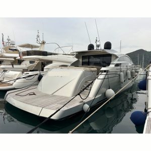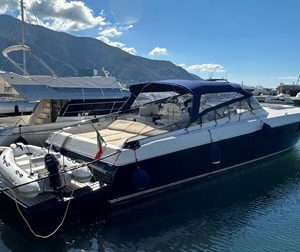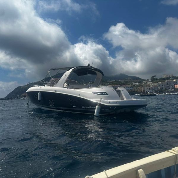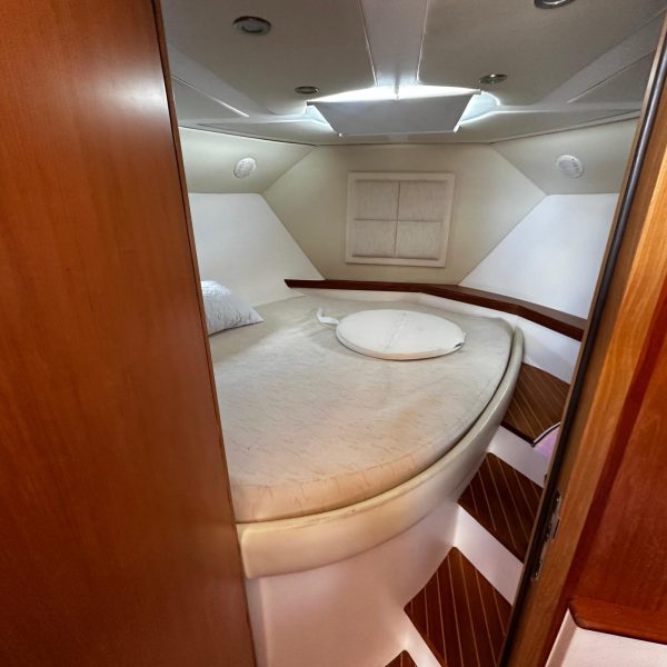Il Gran Sport all’ormeggio si nota subito per le linee di poppa che mettono in evidenza un layout dalle curve morbide e il pozzetto completo, dove la piattaforma bagno assume un ruolo importante sia sotto il profilo puramente estetico che sotto quello funzionale, essendo il primo punto di contatto con l’imbarcazione per accedervi a bordo. Le dimensioni sono massicce, ma ciò aumenta il comfort in fase d’imbarco o di risalita dall’acqua, in quanto la superficie calpestabile mè ampia e antisdrucciolo. L’accesso a bordo è facile, basta infatti seguire il corridoio centrale per trovarsi al centro della dinette. Questa ospita due divani che propongono nella parte sottostante dei gavoni e sul piano di calpestio due staffe che supportano altrettanti tavoli singoli. A centro pagliolo un mobile in vetroresina divide l’area soggiorno da quella di pilotaggio. Nella parte rivolta verso poppa c’è un angolo cottura mentre su quello opposto (lato guida), spicca un divano a tre posti, di cui il cuscino dedicato a chi guida è sollevabile per timonare in piedi. Tre gradini per lato rivestiti di teak portano a prua, sulla tuga, dove un prendisole occupa tutta l’area. Ora inverto il mio cammino e torno in pozzetto, dove noto delle tasche portaoggetti sulle murate.