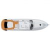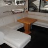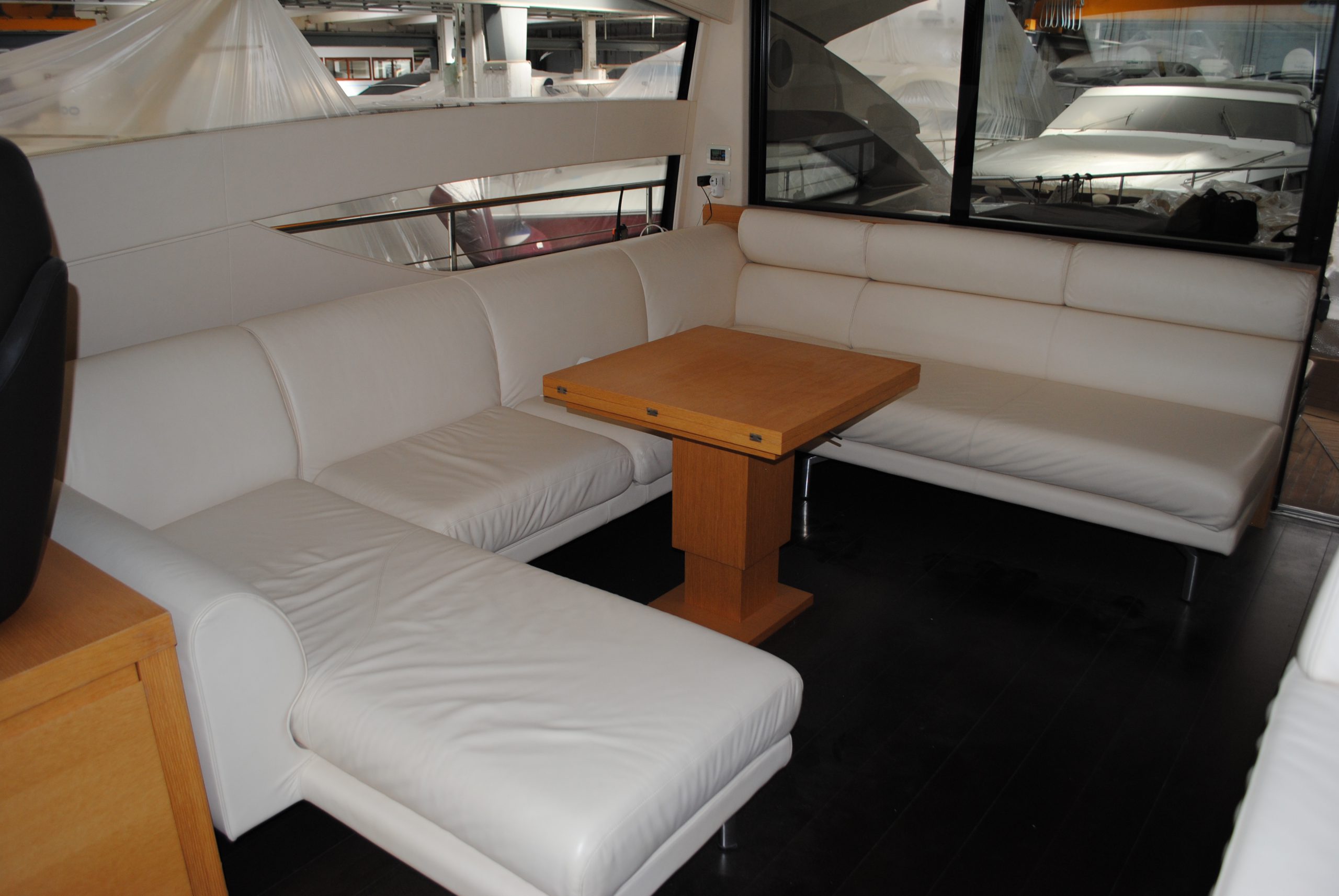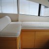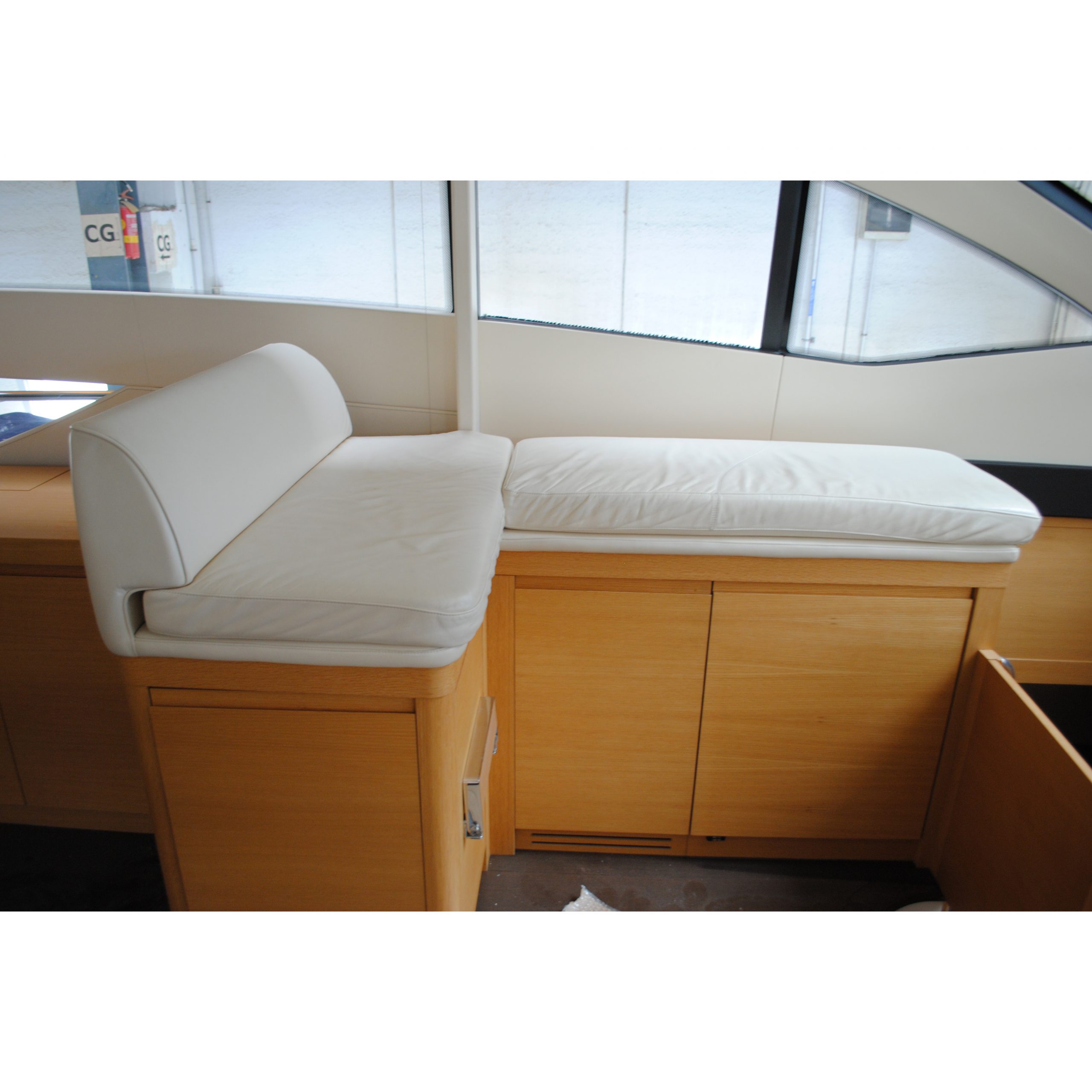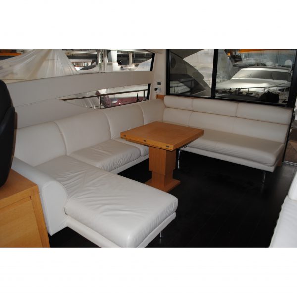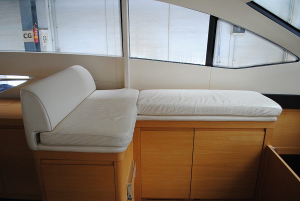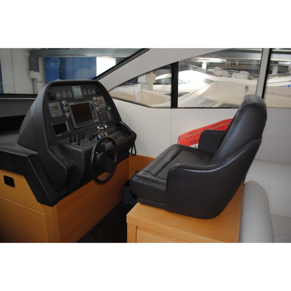 La postazione di pilotaggio è ben posizionata e facilmente accessibile, con una visuale perfetta su tutti i lati della barca. I sedili ergonomici e il volante in pelle offrono un’esperienza di navigazione comoda e sicura, mentre i display touch screen e i sistemi elettronici avanzati facilitano il controllo dell’imbarcazione.