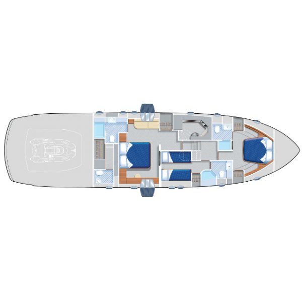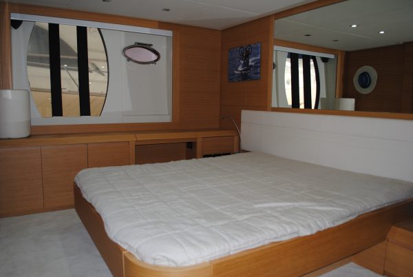 La cabina armatoriale situata a centro barca .Il letto matrimoniale è grande e comodo. I grandi armadi offrono ampio spazio. La cabina è dotata di un bagno privato, elegante e spazioso, con una doccia separata.